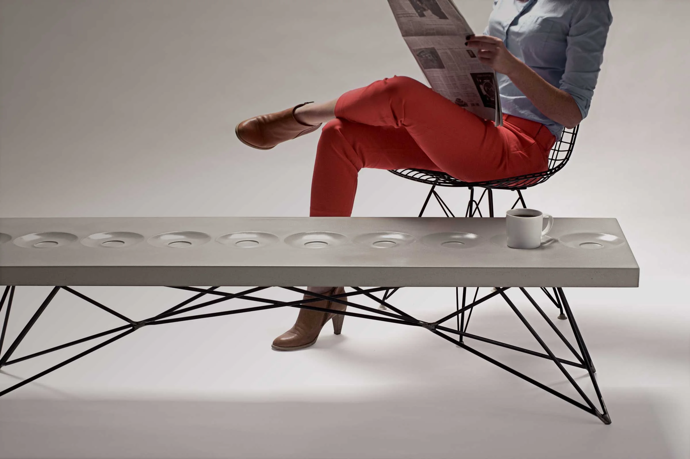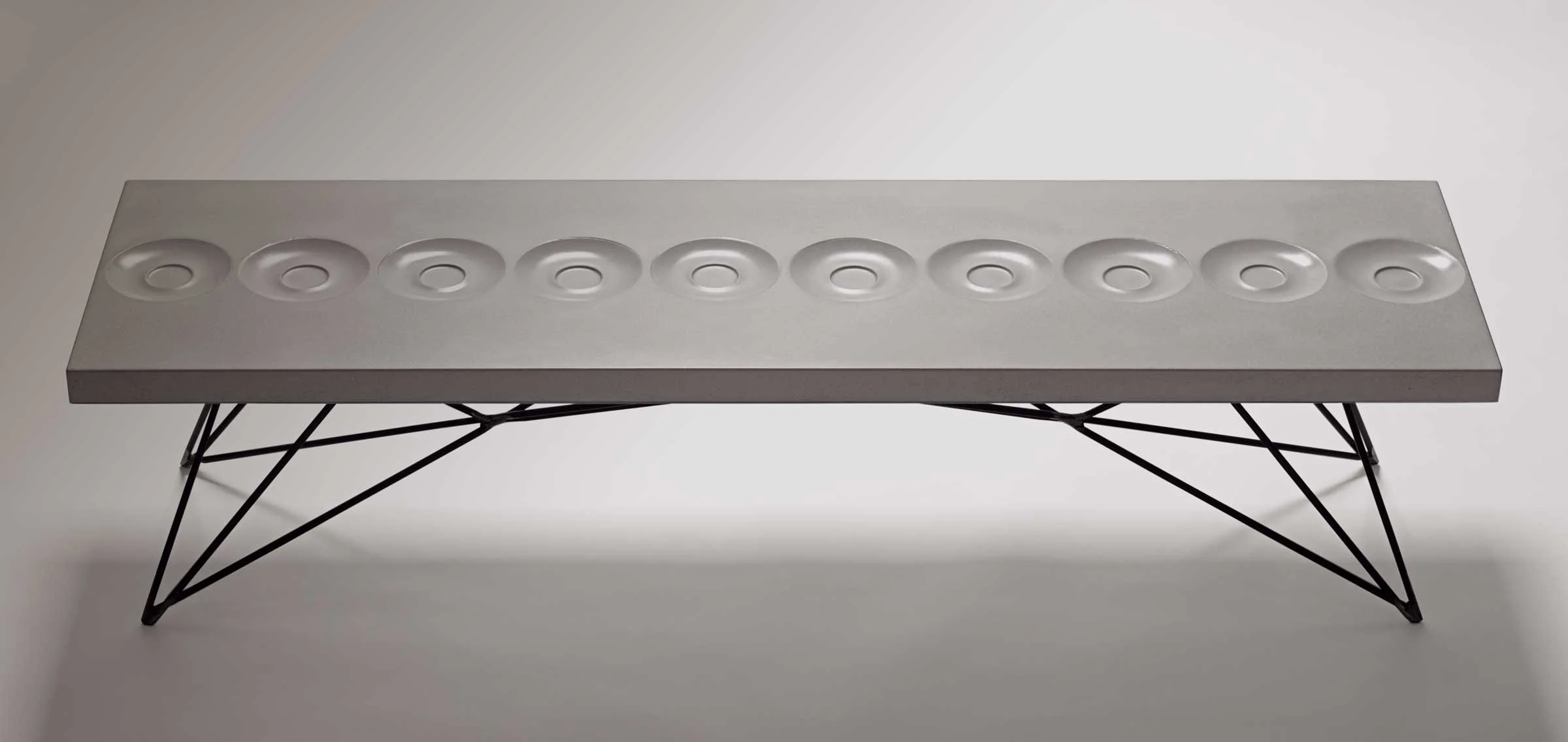 Set into the concrete surface are ten recessed coffee saucers, perfectly sized for cups. After all, shouldn’t a coffee table actually be built for coffee? It’s a touch of whimsical functionality that feels like something straight out of a Seinfeld episode - the same spirit as Kramer’s coffee table book about coffee tables, only this one is built to last for centuries.